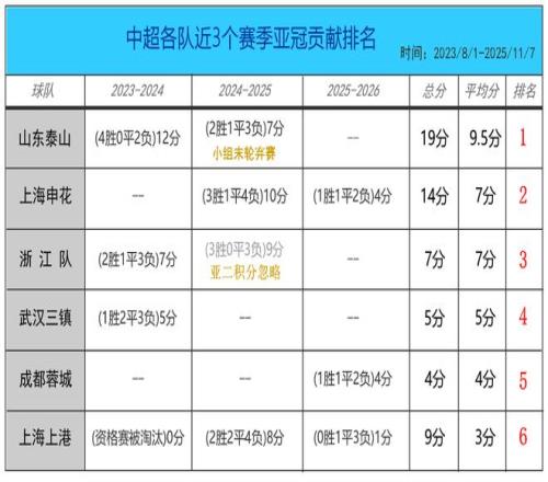 賽季平均分第三多的是浙江隊(duì)。該隊(duì)也參加了兩屆亞冠,不過(guò)2024-2025賽季是踢亞冠二級(jí)聯(lián)賽(成績(jī)3勝0平3負(fù)得9分),就忽略不計(jì),只采用前一屆數(shù)據(jù)。2023-2024賽季,小組賽中取得2勝1平3負(fù)得7分,單賽季平均分就是7分。