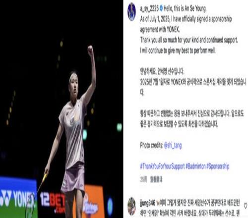今年年初,韓國羽協正式開放運動員個人贊助權益,安洗瑩選擇與尤尼克斯簽約。據韓國媒體透露,這份合同總價值達100億韓元(約合人民幣5300萬元),合同期限為4年,刷新了全球羽毛球運動員的贊助紀錄。此外,韓國羽毛球運動員徐承宰、金元昊也與尤尼克斯簽訂了贊助合約,部分選手則簽約了威克多。