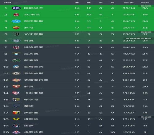 意甲第17輪結束了所有比賽,最新積分榜如下!