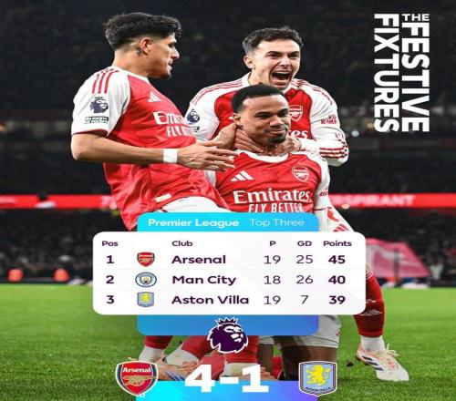 英超第19輪,阿森納主場4-1大勝維拉,目前,阿森納以5分優勢領跑積分榜,鎖定本賽季英超半程冠軍。