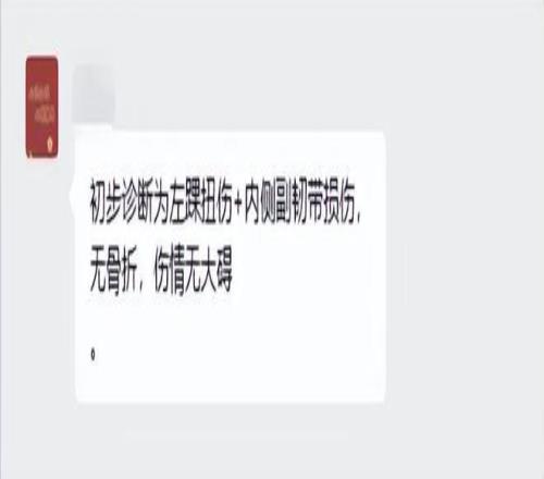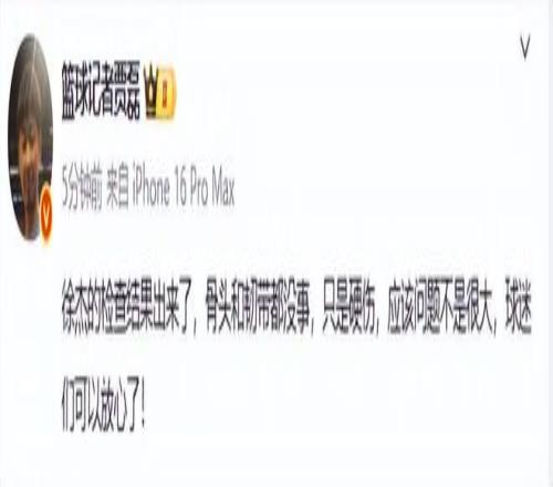 據了解,徐杰受傷后第一時間被送到醫院檢查。據籃球記者賈磊報道,徐杰的檢查結果出來了,骨頭和韌帶都沒事,只是硬傷,應該問題不是很大,球迷們可以放心了!也可以這樣說,徐杰就是左腳踝嚴重扭傷。另據球迷群透露,徐杰左踝扭傷+內側副韌帶損傷,無骨折,傷情無大礙。不過徐杰肯定一時打不了比賽,從現場受傷情況來看,他起碼要休息半個月以上。