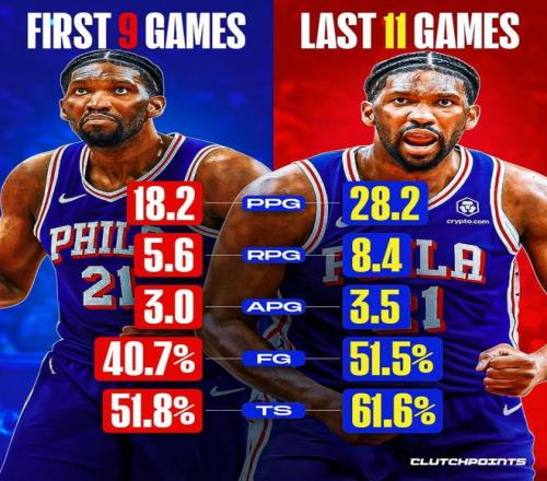 而在本場比賽低迷之前,恩比德已經連續11場交出高光表現,期間場均數據飆升至28.2.分8.4板3.5助,命中率也提升至51.5%,真實命中率61.6%。