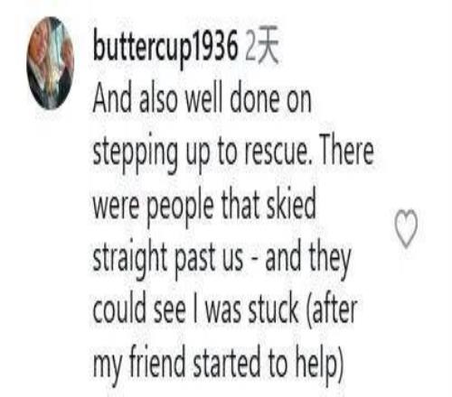 “而且,你能挺身而出救助別人,真的太棒了!當(dāng)時有些人滑著雪徑直從我們身邊經(jīng)過,他們明明看到我被困了(就在我朋友開始救我之后)。”