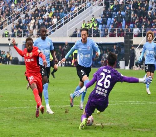 2025年11月22日,上海海港隊球員加布里埃爾(左一)在比賽中射門得分。 當日,在遼寧大連舉行的2025賽季中國足球協會超級聯賽第30輪比賽中,上海海港隊客場1比0戰勝大連英博海發隊,獲得本賽季中超聯賽冠軍。 新華社發