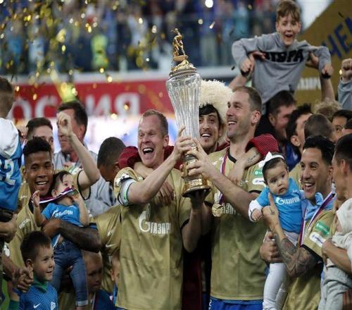 2019年5月5月12日,圣彼得堡澤尼特隊球員慶祝奪冠。 當日,在2018-2019賽季俄羅斯足球超級聯賽第28輪的比賽中,圣彼得堡澤尼特隊主場以3比1戰勝莫斯科中央陸軍隊,隨后舉行儀式慶祝提前奪得本賽季俄超聯賽冠軍。 新華社/歐新