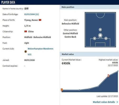 據(jù)紅星新聞援引五星體育消息:德國(guó)轉(zhuǎn)會(huì)市場(chǎng)更新信息,湖南伢子徐彬已成為英超狼隊(duì)U21梯隊(duì)的一員。徐彬司職防守型中場(chǎng),也能勝任中前衛(wèi)和中后衛(wèi),其45萬(wàn)歐元的身價(jià)也創(chuàng)下了個(gè)人職業(yè)生涯的新高。