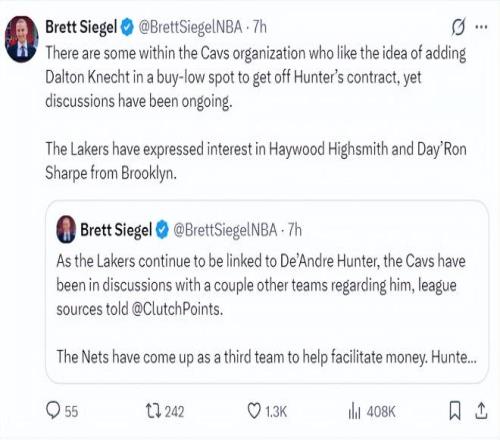 在Brett Siegel的報(bào)道中,湖人隊(duì)有意在交易截止日得到的球員還不止亨特一人,籃網(wǎng)隊(duì)的海史密斯、夏普也是意中人。