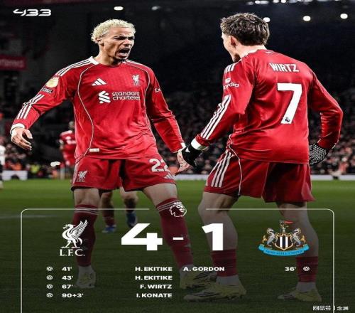 利物浦主場4-1逆轉紐卡斯爾,終結5輪不勝。戈登破門,維爾茨助攻埃基蒂克扳平,隨后埃基蒂克再下一城,薩拉赫助攻維爾茨破門,科納特鎖定勝局。