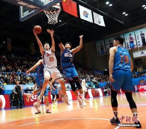 四川男籃隊(duì)員景菡一(藍(lán)衣)得到全隊(duì)最高的14分,在比分落后時(shí)扛起了球隊(duì)進(jìn)攻重任。記者 呂楊攝