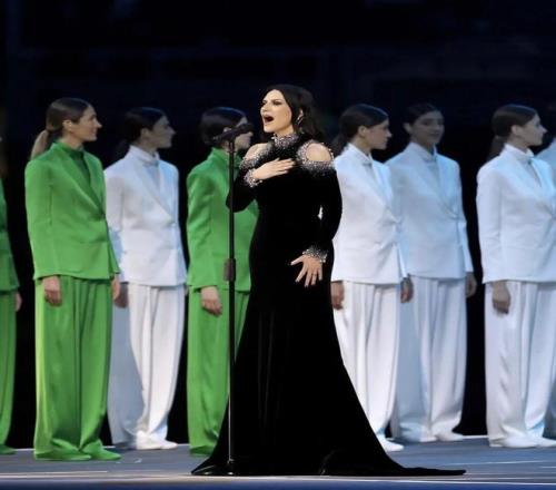 奏唱意大利國歌《馬梅利之歌》時,登臺的意大利女歌手Laura Pausini同樣身著Giorgio Armani Privé高級定制黑色禮服裙,展現浪漫迷人的意式風情和品牌始終不變的優雅格調。