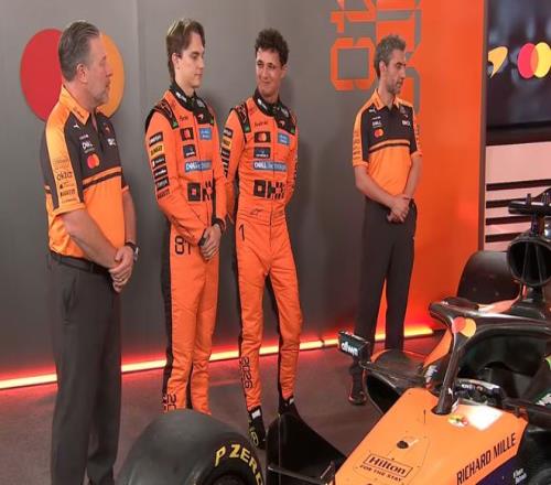 兩位車手,蘭多·諾里斯與奧斯卡·皮亞斯特里,以及車隊負責人安德里亞·斯特拉與首席執行官扎克·布朗共同出席了發布會。