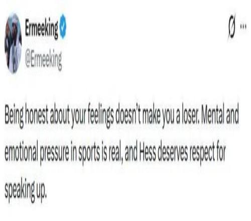 還有網友對赫斯表示支持,“坦誠表達自己的感受并不代表你是個失敗者。體育運動中的心理和情感壓力是真實存在的,赫斯敢于發聲值得尊重。”↓