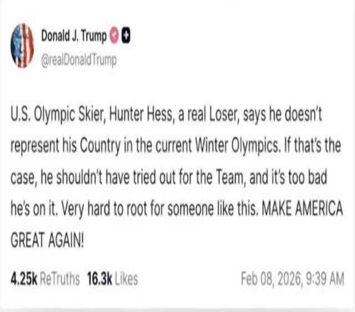他將赫斯的發言解讀為“不代表美國參加本屆冬奧”,并聲稱:“如果真是這樣,他就不該去參加國家隊的選拔,這種人實在讓人難以支持。”