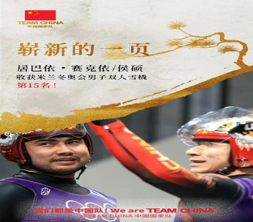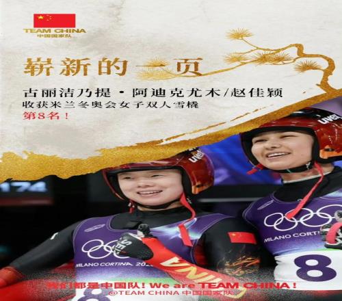 由古麗潔乃提·阿迪克尤木、趙佳穎組成的雪橇女子雙人中國隊,以總用時1分48秒487的成績獲得第8名,刷新中國體育代表團冬奧會該項目的最好成績;由居巴依·賽克依、侯碩組成的雪橇男子雙人中國隊以總用時1分48秒038的成績獲得第15名,再次刷新中國體育代表團冬奧會該項目的最好成績。