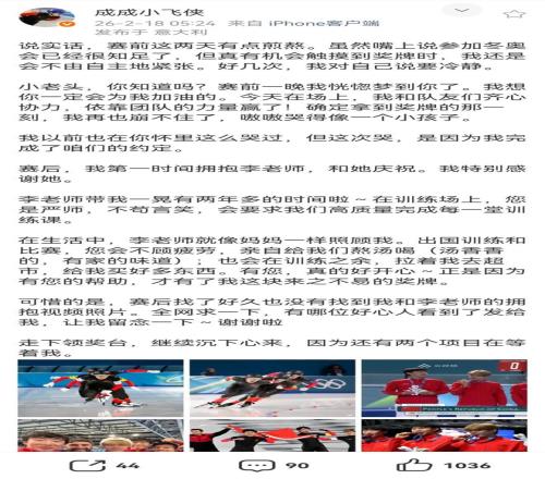 劉瀚彬發長文稱:“說實話,賽前這兩天有點煎熬。雖然嘴上說參加冬奧會已經很知足了,但真有機會觸摸到獎牌時,我還是會不由自主地緊張。好幾次,我對自己說要冷靜。……走下領獎臺,繼續沉下心來,因為還有兩個項目在等著我。”