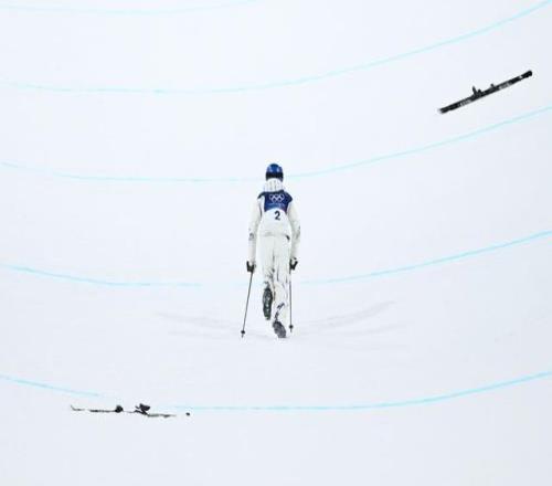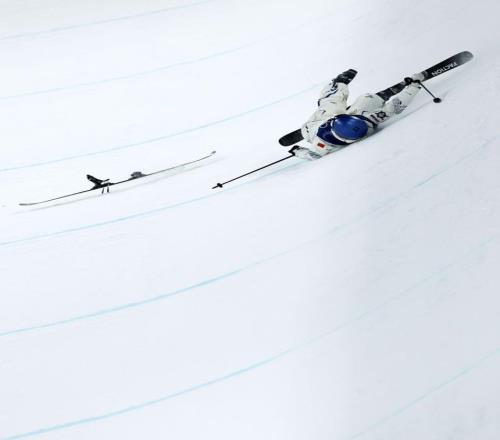 2月19日,中國選手谷愛凌在比賽中摔倒后站起。新華社記者 鄔惠我 攝