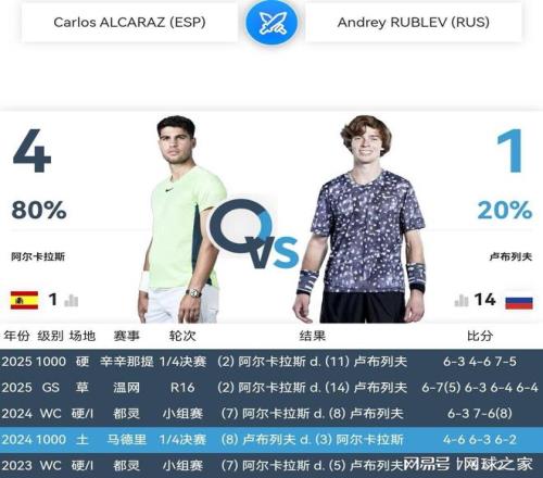 明天凌晨零點半,ATP500多哈站第一場半決賽,世界第一、西班牙全能戰士阿爾卡拉斯對陣世界排名第14的俄羅斯金絲猴盧布列夫。繼第一輪、第二輪法國選手林德克內希和魯瓦耶之后,俄羅斯選手、前賽會冠軍卡恰諾夫和盧布列夫,前赴后繼挑戰世界第一阿爾卡拉斯,好不熱鬧!