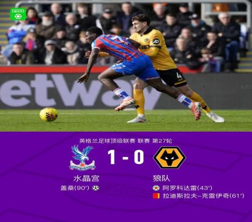 北京時間2月22日英格蘭足球頂級聯賽 聯賽 第27輪,水晶宮主場對陣狼隊。水晶宮蓋桑破門。最終比分水晶宮 1-0 狼隊。