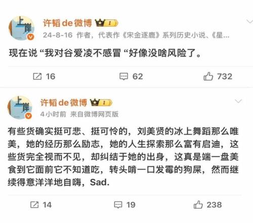 很多中國人又有一個很大的毛病,就是對正面人物苛刻,對負(fù)面人物寬容。因為揭露美國斬殺線而名動天下的牢A就深知這一點,所以他要自我暴露自我貶低,就是不想被人用完美人設(shè)進(jìn)行衡量打擊。帶頭攻擊牢A的和帶頭攻擊谷愛玲的,也有著很高的重合度,他們都是讓精神美國人很不高興的人。當(dāng)然,攻擊谷愛凌的,也不只是精神美國人,還有一些人雖然越愛中國,但又容易被帶節(jié)奏,在精神層面又喜歡寬以待己,嚴(yán)于律人,喜歡對正面的名人用完美人設(shè)去要求。