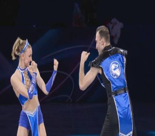 整場(chǎng)表演設(shè)計(jì)極具巧思:開(kāi)場(chǎng)階段,兩人站在冰場(chǎng)邊緣模擬日常對(duì)話,梅特爾基娜提議去觀看花樣滑冰表演,貝魯拉瓦則表示更想玩電腦游戲,并提出教搭檔玩游戲,隨后兩人身著《真人快打》中經(jīng)典角色吉塔娜、絕對(duì)零度的造型登場(chǎng),正式開(kāi)啟冰上表演。