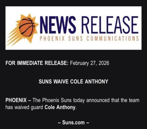 來自名記Shams的最新報道,菲尼克斯太陽已經裁掉了球隊后衛科爾安東尼,隨后太陽官方發表聲明宣布了這一消息。