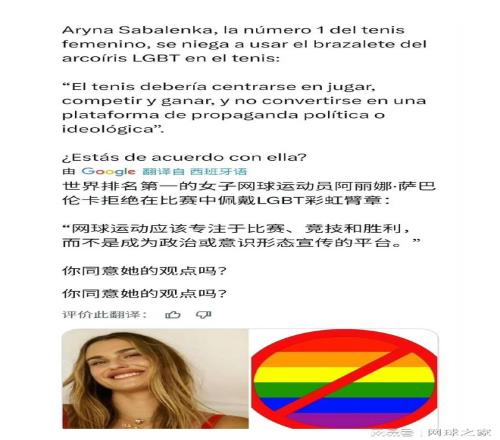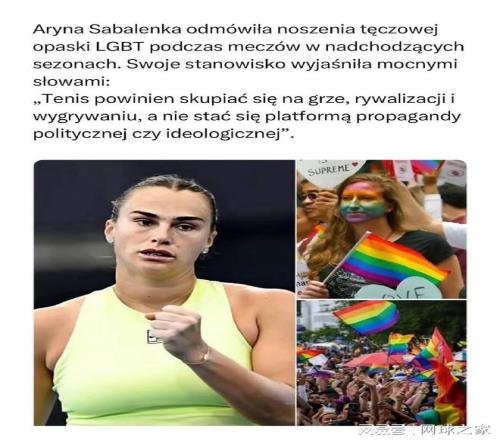 近日,一則帖子在外網(wǎng)瘋狂傳播。帖主聲稱,阿琳娜·薩巴倫卡已“拒絕在未來賽季的比賽中佩戴LGBT彩虹手環(huán)”,并配以強(qiáng)硬的言辭闡述其立場:“網(wǎng)球應(yīng)該專注于比賽、競爭與勝利,而不是成為政治或意識形態(tài)宣傳的平臺。”