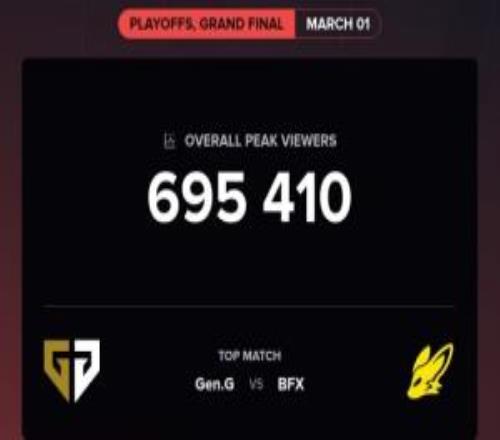 體育資訊03月02日稱 數據網站公布了昨日2026LCK Cup總決賽GEN vs BFX的直播熱度情況,本場Bo5觀眾峰值只有69.5w,連去年同期決賽熱度的一半都不到。