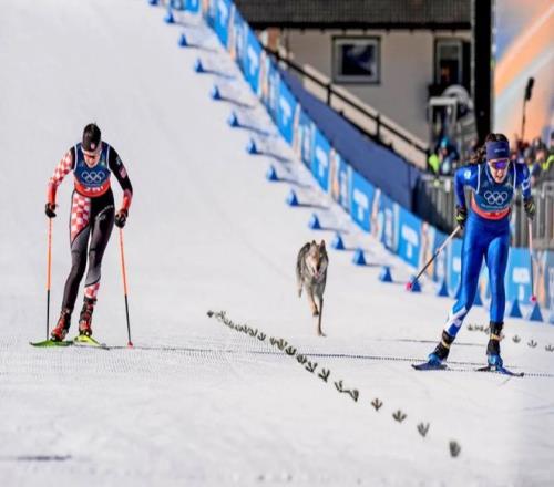 2月18日,越野滑雪女子團體短距離自由技術預賽闖入了一位特別的“選手”。雪白的賽道上,2歲的狼犬納茲古爾突然入鏡,和運動員們一起沖向終點。沒有過激的慌張和驅逐,組委會反而為這只狗狗剪輯了沖刺慢鏡頭畫面,還一本正經地分析了它沖線時的運動姿態。