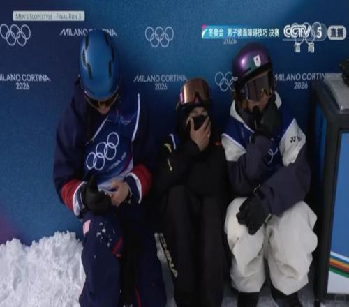 單板滑雪男子坡面障礙技巧決賽最后時刻,蘇翊鳴和另外兩名暫列前三的選手擠在雪地角落里,等著最后一名的新西蘭選手完賽。三個人縮成一團,各懷心事,準銅牌選手緊張地刷著手機,準金牌選手蘇翊鳴則干脆拉起面罩遮住眼睛,不敢直視。