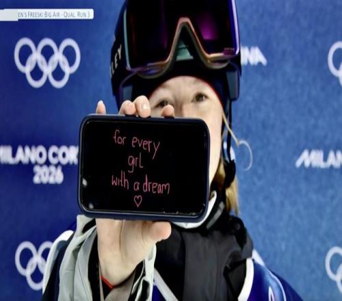 同樣讓人移不開眼的,還有19歲的德國選手默爾,她在完成自由式滑雪女子大跳臺預賽第三跳后,向鏡頭展示了手機里的粉色字跡——“for every girl with a dream (致每一位心懷夢想的女孩)”。手機后,她淺色的雙眸帶著笑意。