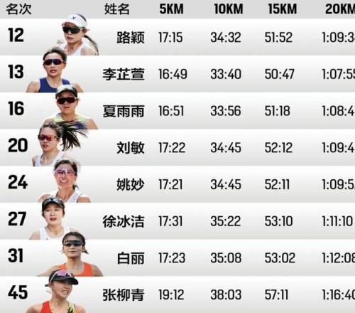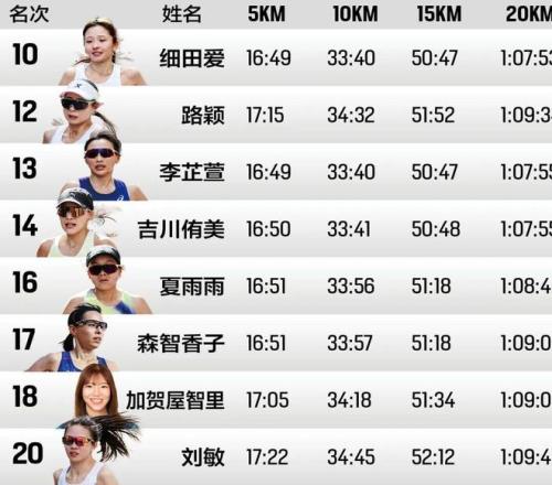 10公里時,李芷萱緊咬細田愛,10公里用時33分39秒,3分22的配速稍快。夏雨雨用時33分56秒,路穎用時34分32秒,劉敏和姚妙依舊跑在一起,用時34分45秒。15公里,細田愛和李芷萱依舊處于女子第二集團,李芷萱15公里用時50分47秒。整個前半程,女子選手方面相對穩定??扑股w和克貝德繼續領跑,半程用時1小時07分36秒。中國女選手中,李芷萱半馬用時1小時11分39秒、夏雨雨用時1小時12分33秒、路穎用時1小時13分20秒、劉敏1小時13分38秒、姚妙1小時13分40秒、徐冰潔1小時15分。一直以“安全完賽”為目標的李芷萱到半程后還安慰自己,“希望后面可以不退賽”。
