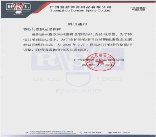 2月28日,羽毛球的龍頭企業亞獅龍,也發布了降價通知。超牌、威肯……不少品牌陸續跟上降價的步伐。尤尼克斯(YONEX)至今未發布官方降價通知,但終端價格已隨庫存消化開始松動。