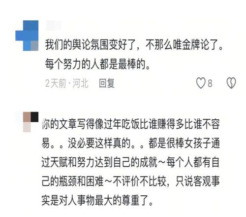這些意在致敬李方慧的語句,在評論區引發爭議。有人為李方慧的故事動容,認為更多默默無聞的運動員因這樣的文字而被看見,可也有人發出疑問:為什么講述一位運動員的價值,需要將她的生長環境置于與另一位運動員的對比框架中?