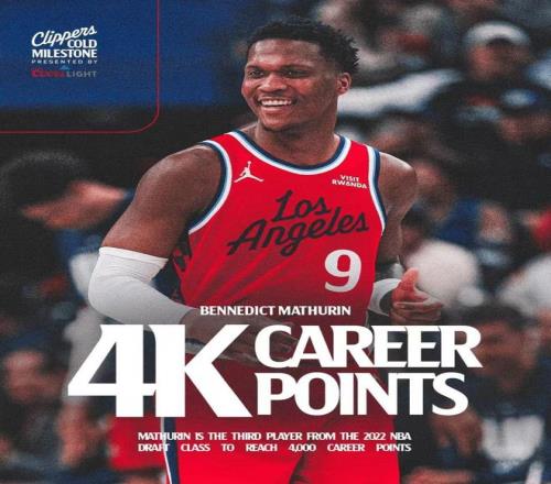 快船新援馬瑟林迎來生涯常規賽4000分里程碑,成為2022屆選秀第3人,前兩位是班凱羅與杰倫-威廉姆斯。