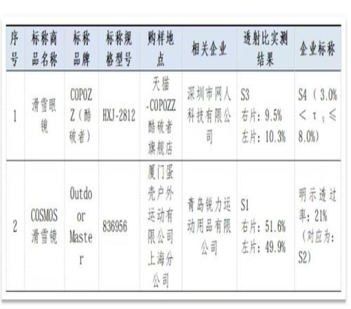 表格顯示,可見光透射比實(shí)測等級或數(shù)值與標(biāo)稱信息不符的樣品分別為深圳市網(wǎng)人科技有限公司生產(chǎn)、商標(biāo)標(biāo)稱為“COPOZZ(酷破者)”樣品,以及青島銳力運(yùn)動用品有限公司生產(chǎn)、商標(biāo)標(biāo)稱為“OutdoorMaster”樣品。