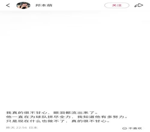 邦本萌寫道:“我真的很不甘心,眼淚都流出來了。他一直在為球隊拼盡全力,我知道他有多努力。只是現在什么也做不了,真的很不甘心。