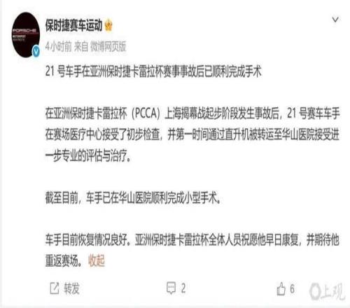 3月15日,亞洲保時捷卡雷拉杯房車賽組委會發布 “報平安” 信息:在14日上海揭幕戰發車階段遭遇事故后,保時捷卡雷拉杯亞洲組21號車手已在華山醫院接受小型手術,目前車手恢復情況良好。