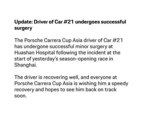 據中國首位F1賽季全勤報道者錢俊透露:3月15日,亞洲保時捷卡雷拉杯房車賽組委會發布通告,標題為 “最新消息:21號車車手手術成功”。通告表示,“在昨日上海揭幕戰發車階段發生事故后,保時捷卡雷拉杯亞洲組21號車車手已在華山醫院成功接受小型手術。目前車手恢復情況良好,保時捷卡雷拉杯亞洲組全體人員祝愿他早日康復,期待他重返賽場。”