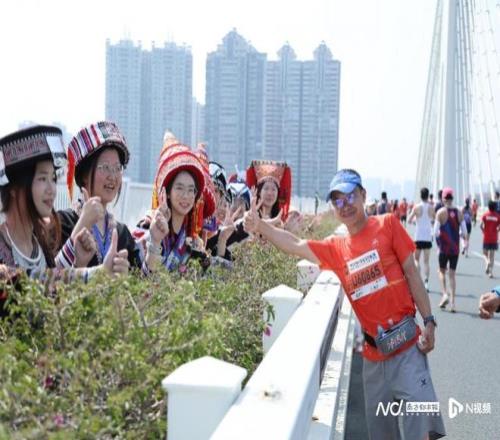 兩座大橋上,身穿壯、瑤民族服飾的“清馬寶貝”啦啦隊與跑者們擊掌助威。