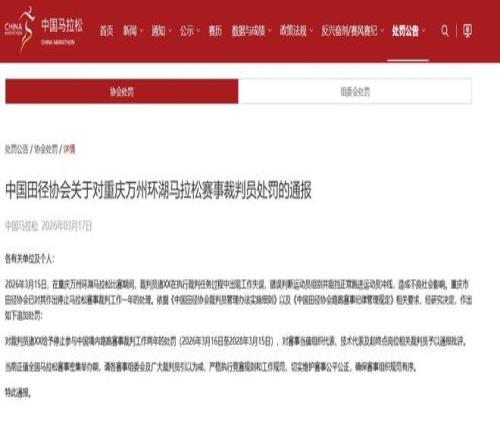 2026年3月15日,重慶萬州環湖馬拉松比賽期間,裁判員出現工作失誤,錯誤判斷運動員組別并阻擋正常跑進運動員沖線,造成不良社會影響。重慶市田徑協會與中國田徑協會已依據裁判管理相關規定對涉事裁判員作出處罰。