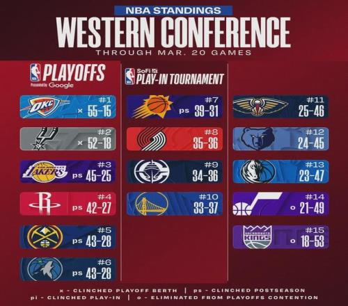 北京時間3月21日,NBA常規賽:掘金121-115戰勝猛龍,火箭117-95大勝老鷹,森林狼104-108不敵開拓者。西部排名又出現了比較大的變化:火箭和掘金各上升一位,森林狼跌至第六。此外,開拓者反超快船,升至西部第八。