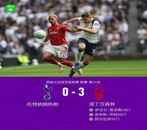 北京時(shí)間3月22日英格蘭足球頂級(jí)聯(lián)賽 第31輪,托特納姆熱刺主場(chǎng)對(duì)陣諾丁漢森林。上半場(chǎng),威廉斯角球開(kāi)出,熱蘇斯頭球破門(mén)。下半場(chǎng),懷特、阿沃尼伊相繼破門(mén),鎖定勝局。最終比分熱刺 0-3 諾丁漢森林。