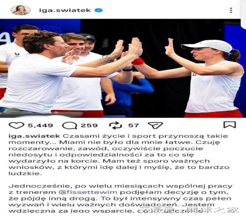 從2024年10月斯瓦泰克結束與前教練合作后首次與費塞特聯手,到今年3月正式結束合作,斯瓦泰克和費塞特一共合作了一年半時間,在這期間斯瓦泰克還是取得了不錯成績的,其中最大亮點莫過于2025年溫網奪冠,斯瓦泰克表示費塞特幫助自己實現了“職業生涯最大夢想之一”(溫網奪冠)。